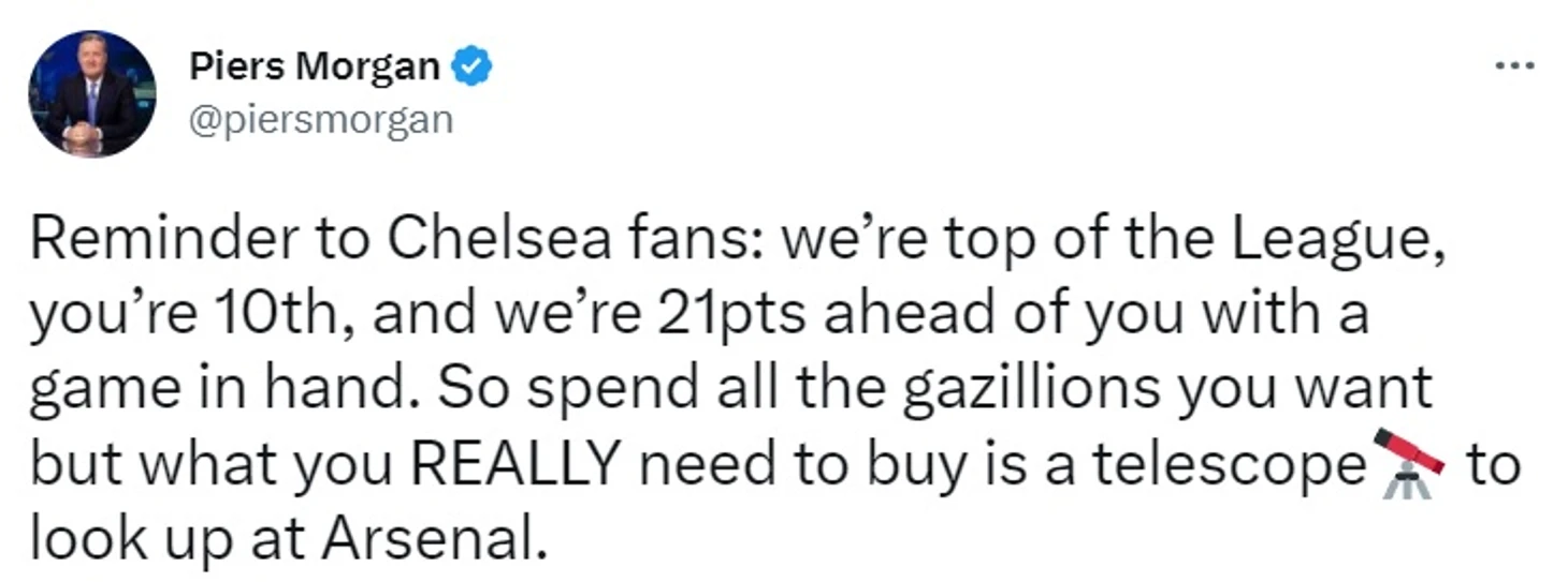 «Напоминание болельщикам «Челси»: мы лидируем в лиге, вы на 10-м месте, а мы опережаем вас на 21 очко с игрой в запасе. Так что потратьте все миллиарды, которые вы хотите, но вам ДЕЙСТВИТЕЛЬНО нужно купить телескоп, чтобы смотреть на Арсенал».
