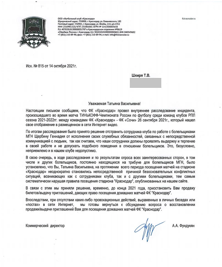 14 октября 2021 года Татьяна Шкиря получила письмо от коммерческого директора ФК «Краснодар» Арама Фундукяна, в котором сообщается, что ФК «Краснодар» принято решение до конца 2021 года приостановить ей продажу билетов / выдачу приглашений, дающих право посещения домашних матчей ФК «Краснодар»: