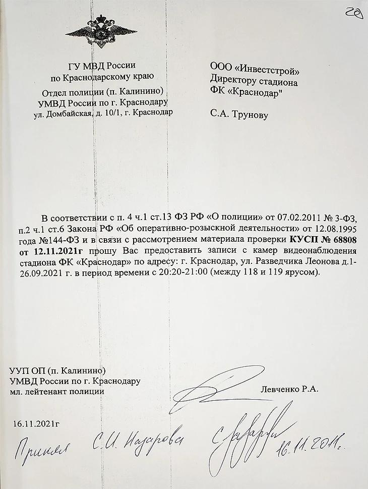 Арам Фундукян не ознакомил Татьяну с результатами внутреннего «расследования», не привел ей и общественности никаких доказательств, что она когда-либо нарушала правила посещения стадиона «Краснодар». ООО «Инвестстрой» даже не предоставил полиции записи с камер видеонаблюдения стадиона: