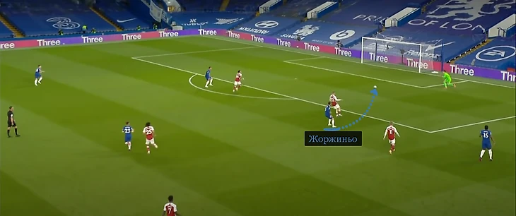 Третий – по иронии, из матча с «Арсеналом»-20/21. Жоржиньо принял мяч в опорной зоне и отпасовал на Кепу Аррисабалагу. Получилось не по адресу, но в створ, который испанец покинул. Голкипер в последний момент спас итальянца от автогола, но вторым темпом накрыл Эмиль Смит Роу.