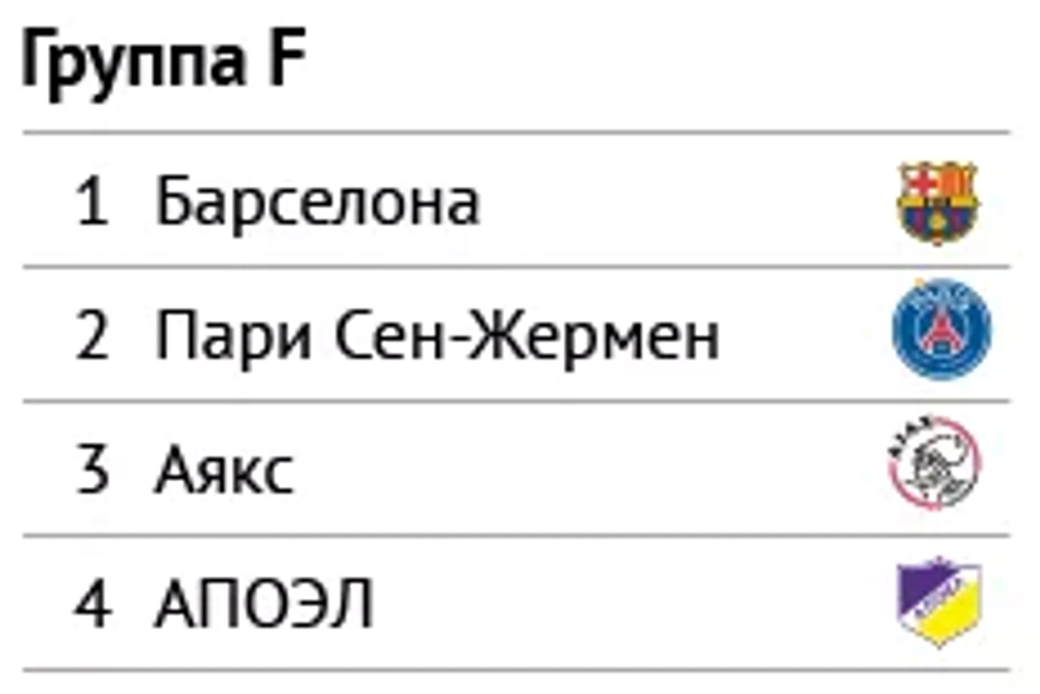 Каталонцы по два раза выиграли «АПОЭЛ» и «Аякс», с «ПСЖ первый матч отыграли со счетом 3:2 не в свою пользу, а второй матч против французской команды они выиграли со счетом 3:1. Именно «Барса» заняла первое место в группе.
