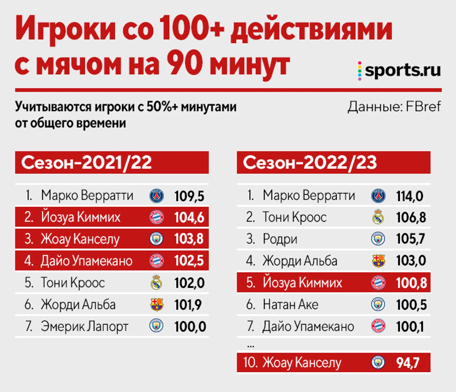 Канселу переехал в систему, где есть еще два футболиста, работающих с мячом больше 99% других игроков: Йозуа Киммих и Дайо Упамекано. Они не любят стерильное владение. Больше Киммиха в топ-5 лигах продвигающие передачи делают только Месси, Верратти и Кроос. Больше Упамекано из центральных защитников вперед пасует лишь пара из «Ланса»: Факундо Медина и Жонатан Гради. Канселу в сезоне-2021/22, когда достиг пика в амплуа ложного фулбэка, лидировал по продвигающим в «Ман Сити».