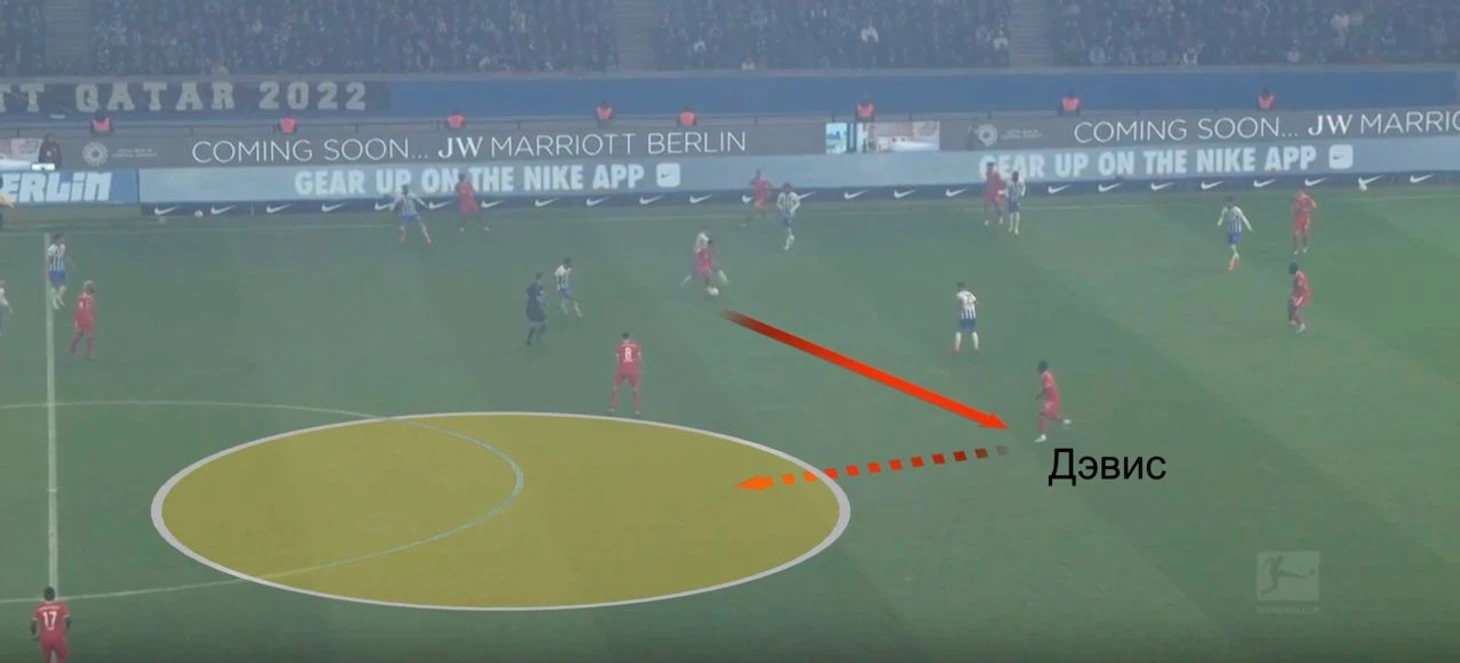 Неочевидный фактор – апгрейд Дэвиса. В позиционных атаках он может стартовать с позиции левого центрального защитника (очень условно). Не спешите возражать! Он уже давно не приклеен к бровке, обычно тащит мяч на рывках именно в полуфланге. В низкой стартовой позиции поодаль от партнеров по обороне активируется главный навык: ловкий дриблинг из глубины (прямо из впадины) на скорости. «Бавария» способна стягивать командные розыгрыши ближе к флангу Канселу, чтобы разряжать левый фланг и переводом запускать в свободное пространство Дэвиса.