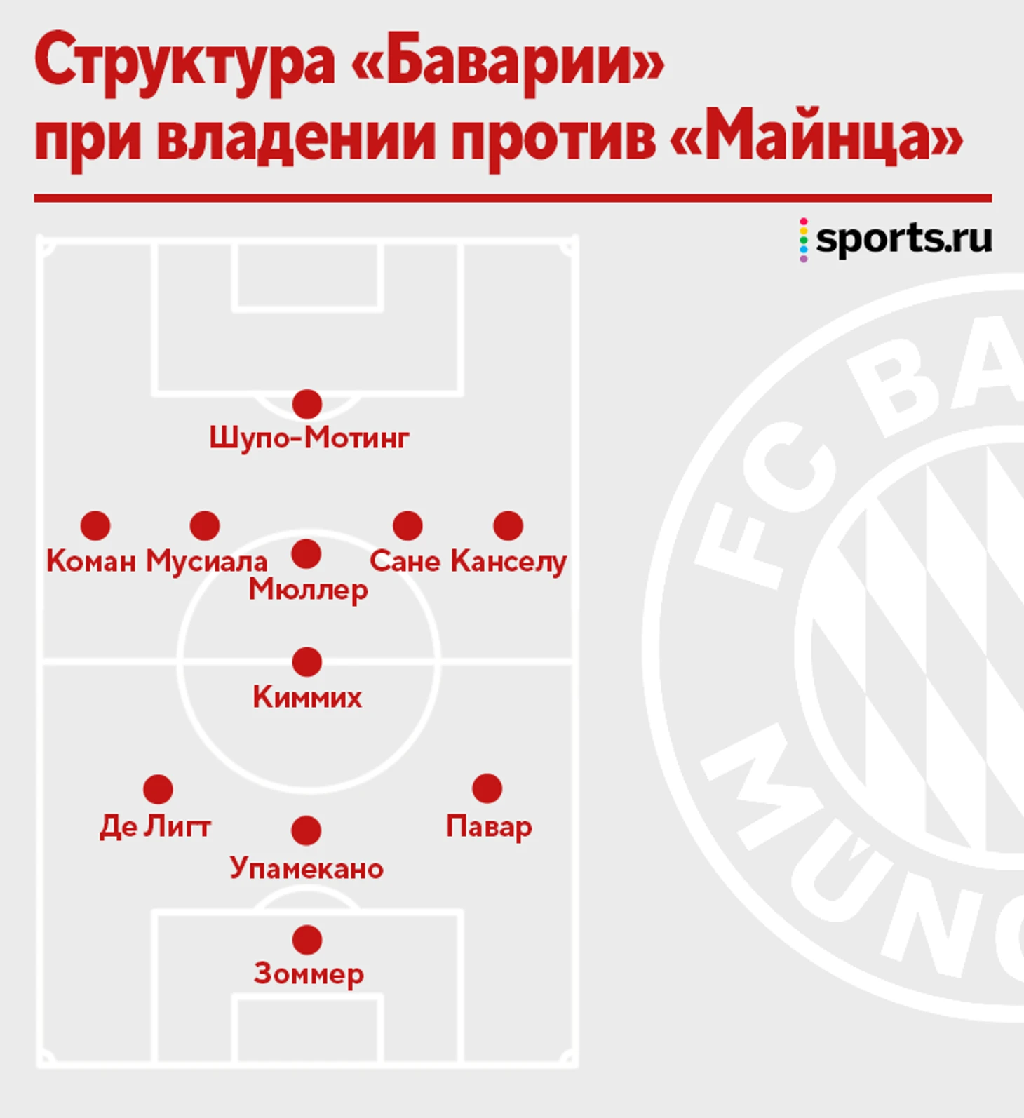 Нагельсманн активно пробует схему 4-1-4-1 с атакующими игроками в центре поля (Джамал Мусиала, Лерой Сане, Томас Мюллер). Со смещением Канселу структура может трансформироваться в 3-2-4-1, атакующие игроки в позиционных атаках будут подниматься выше в поисках пространства между защитой и полузащитой соперника. Это главный навык Мусиалы, Сане тоже прекрасно предлагает себя, Мюллер не нуждается в представлении. Еще важнее, что сам Нагельсманн любит насыщать опорную зону соперника, когда сразу два-три игрока выступают в роли плеймейкеров. Они ждут паса из глубины и затем разыгрывают комбинации накоротке/дают обостряющую передачу под удар/идут в дриблинг/бьют сразу.