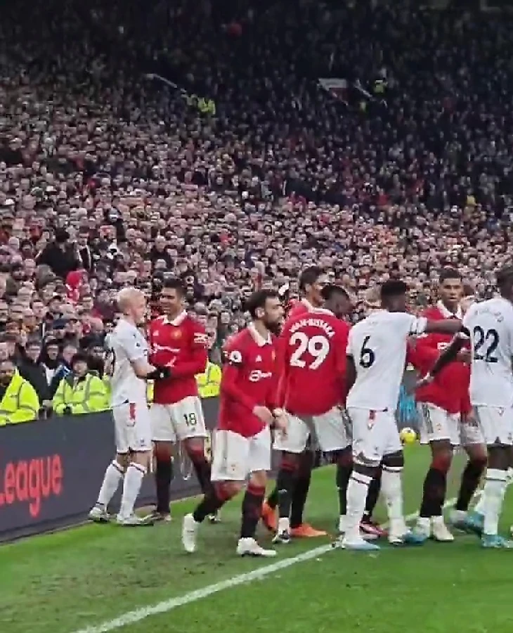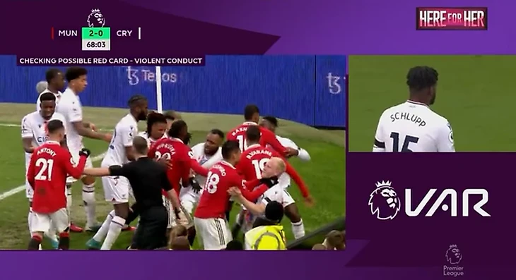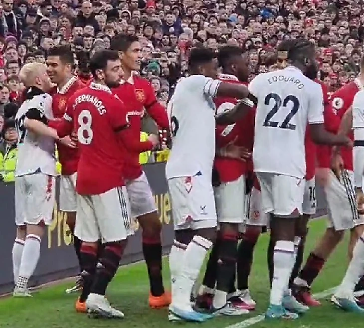 Игроки «Юнайтед» встали на защиту товарища, и началась куча мала. Футболисты обеих команд вели себя крайне некрасиво, но только Каземиро в итоге получил прямую красную (кстати, первую в своей карьере). ВАР принял такое решение из-за того, что полузащитник «красных дьяволов» придушил Уилла Хьюза.
