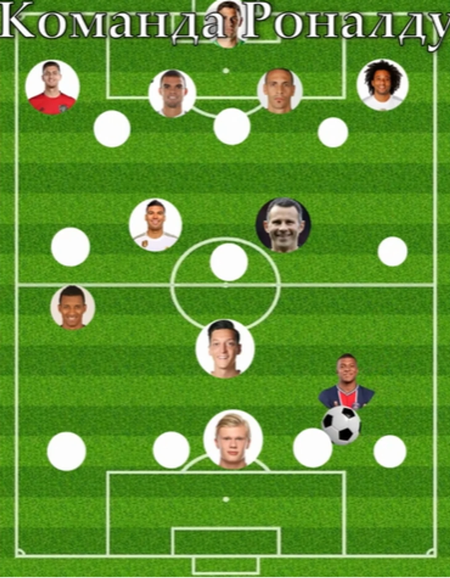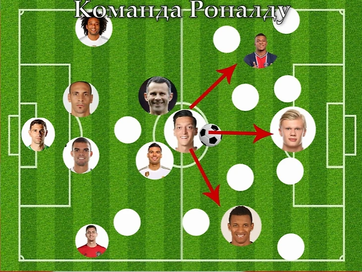 В полузащите у Роналду сыграет португалоговорящий Каземиро, с которым у Криро неплохие отношения, судя по фоткам из стана «Юнайтед» и «Реала», а также Райан Гиггз и Месут Озил, которых можно назвать одними из лучших партнёров в карьере 5-кратного обладателя ЗМ. В 2013 году Криш, например, сильно негодовал после того, как Перес продал Озила в «Арсенал». «Я не понимаю, как 'Реал' мог избавиться от игрока, который мог в одиночку решить исход матча. Я зол из-за этого трансфера. Для меня нет сомнений, что Озил был лучшей 'десяткой', которая могла бы быть в 'Реале'», - заявлял Роналду.