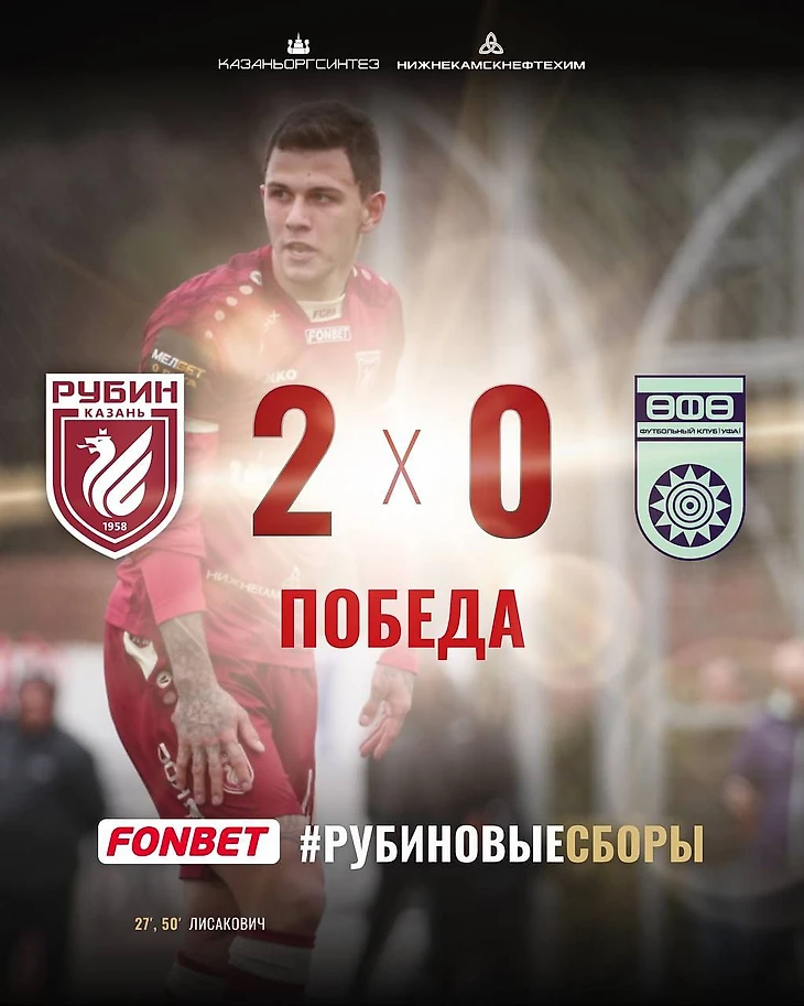 Но все это только начало, ведь машина, под названием Рубин, за рулем которого сидит Юрий Уткульбаев, не собиралась останавливаться. Татаро-Башкирское Дерби, одна из самых интересных встреч на сборах, завершилась вновь в пользу Казанцев, на этот раз, со счетом 2-0 и дублем Лисаковича