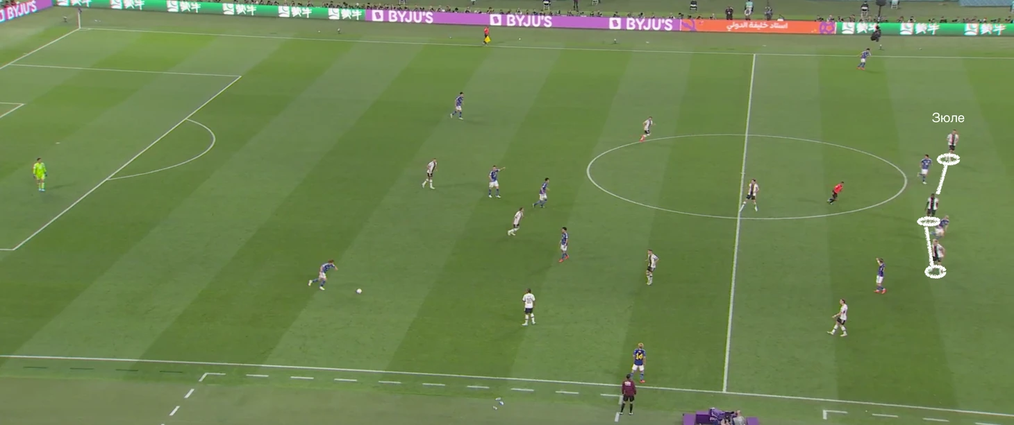Антипример: Никлас Зюле, Германия. Одна из самых бредовых (самое мягкое слово из возможных) ошибок на ЧМ – реакция Зюле на открытый мяч Итакуры со свободного. Два ближних к мячу защитника, Шлоттербек и Рюдигер, держали линию и показательно запускали в офсайд Асано в момент рывка от Рюдигера. Зюле видел двух партнёров перед собой, но необъяснимым образом среагировал не на их действия, а на рывок Минамино от себя в глубину. Результат – созданная глубина, гандикап Асано перед Шлоттербеком, в чью зону пошло ускорение, длинная передача под выход на ворота и прогулка Зюле до своих ворот.