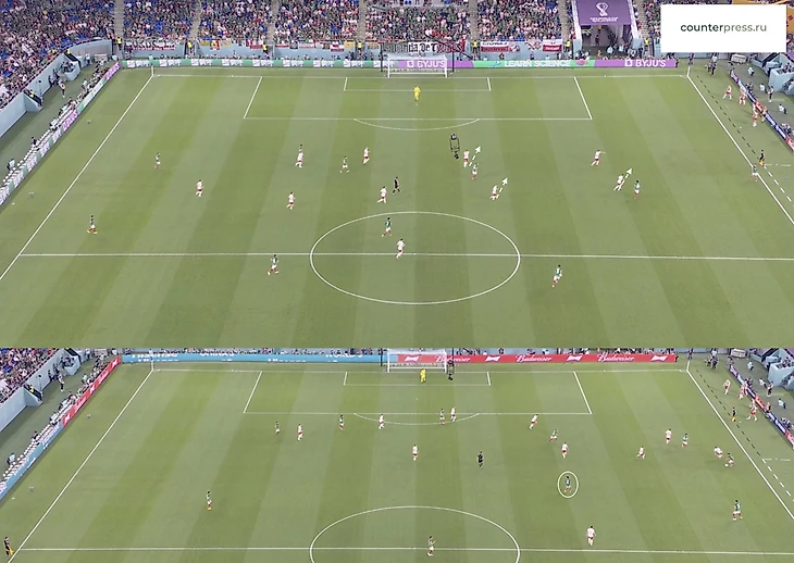 Реакция на открытый мяч на дистанции матчей группы тоже не была слишком стабильной: у Аргентины редко получалось манипулировать обороной саудовцев, но у той же Мексики в самом начале матча сразу возник убойный шанс после красивого вскрытия блока – этот эпизод уже упоминался выше. Уже в первом тайме линия саудовцев наелась, постоянно бегая за мексиканцами, которые легко выходили на открытый мяч и грамотно атаковали из глубины, раскачивая линию, атакуя глубину в два темпа. Хотя важно, что саудовцы были обескровлены травмами к последнему матчу.