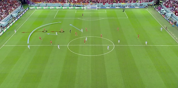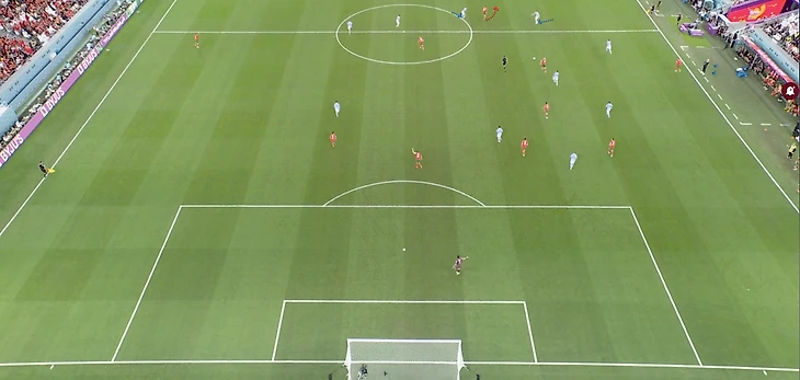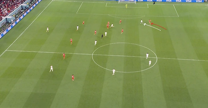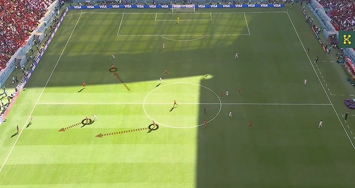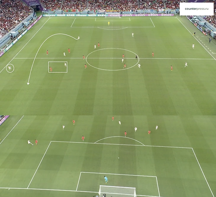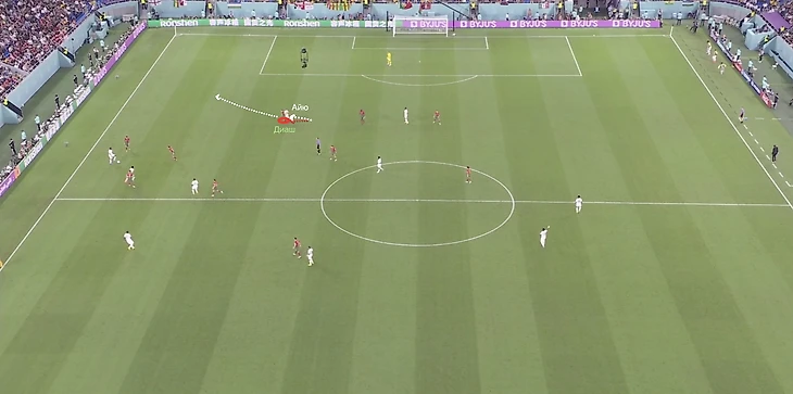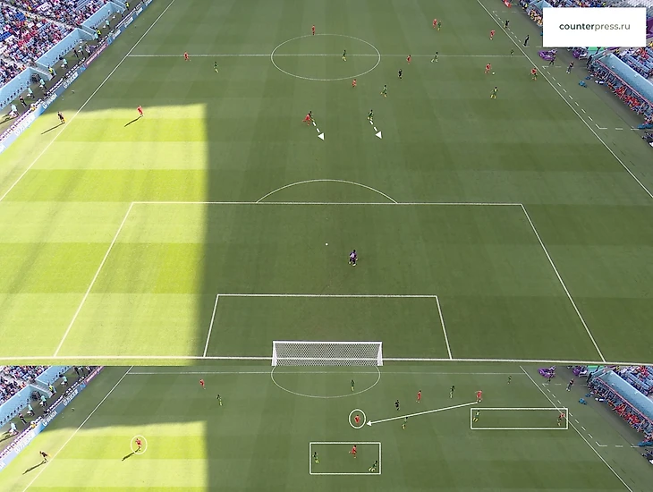 Только Испания на ЧМ создала Марокко проблемы на открытом мяче напрямую. Испанцы создавали ромб на фланге, где Альба делал ускорение за спину, как только готовили открытый мяч, и ловили на выдвижениях ближнего центрального защитника Агерда чуть из створа, чтобы помогать Хакими с покрытием глубины. Но за спиной Агерда – и далеко от Саисса – открывание за спину делал Асенсио. Испания дважды поймала Марокко на таком насыщении зоны, один из моментов привёл к выходу Асенсио на вратаря под углом. Португалия в четвертьфинале тоже пользовалась ситуациями с открытым мячом, но не растягивала пространство за спинами, а ловила подбор перед защитниками после заброса – это уже немного другой контекст.