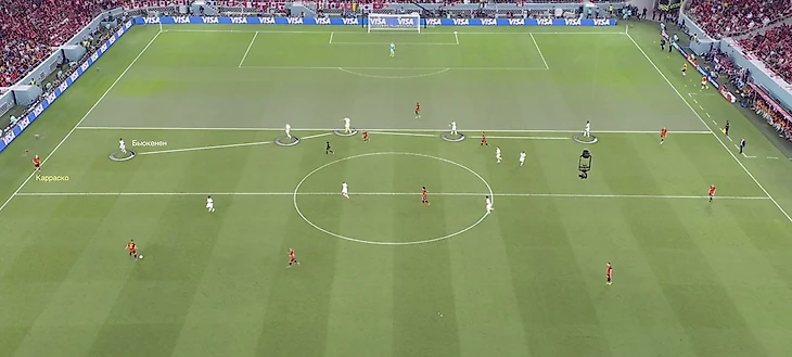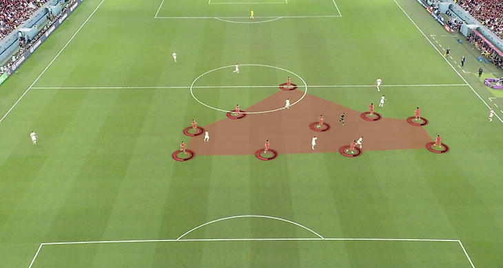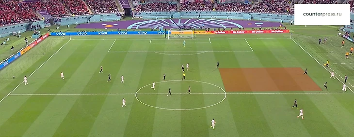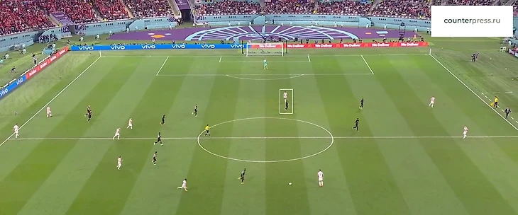 Самый явный пример такого подхода – сборная Марокко. Команда не накрывала начало атаки от вратаря, не шла в активный прессинг по передаче назад и ждала соперника в среднем блоке, но почти не пускала на свою треть за счёт отличной организации. Постоянно перекрытый центр и давление восьмёрок на коротких рывках загоняли соперников на фланги, где Марокко быстро перестраивалось и избегало перегрузов. Компактность между линиями и между игроками, постоянное давление на мяч, быстрые перемещения на коротких рывках сделали Марокко командой, которая защищалась много, но очень организованно и надёжно.