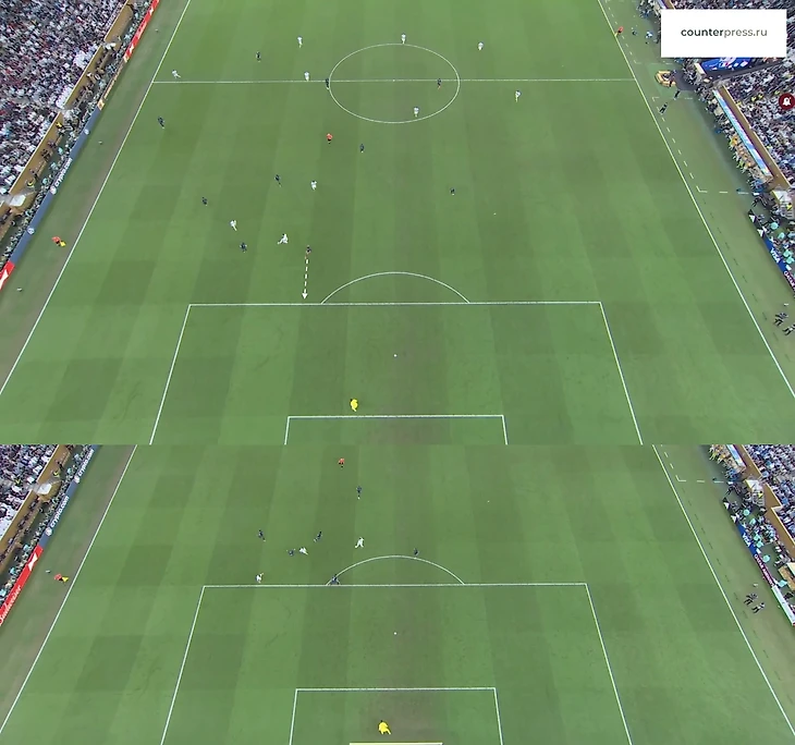 Поэтому на примере сборной Аргентины достаточно ярко видны все косвенные и прямые плюсы системы игры с уступом на открытом мяче. Недостатки в структуре аргентинцев с компактностью маскировала отличная игра 1в1, агрессия в своей трети – эти аспекты буквально можно разбирать себе в плейбук и показывать как образец игры 1в1 в обороне. Но есть нюанс: такое раскрытое пространство между линий – роскошь, которую трудно себе позволить против более системных команд, чем сборные на чемпионате мира, и которую трудно представить в команде, которая не сможет на более длительной дистанции настолько же рьяно выигрывать единоборства в своей трети, как заряженная на трофей сборная Аргентины.