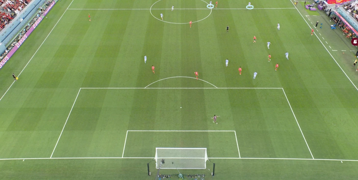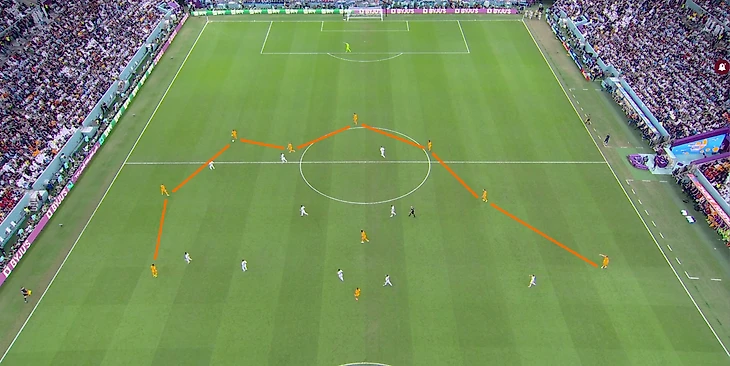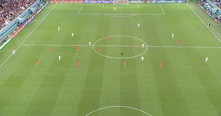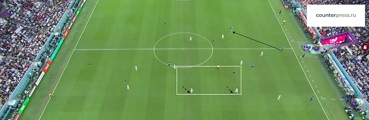 И снова следствие предыдущего тренда. Игра между линиями – сама по себе риск, а структуры владения многих сборных на ЧМ-2022 естественным образом ограничивали риск: зачем играть между линиями, если мы расставляемся так, чтобы контролировать мяч за счёт ширины поля, и не насыщаем пространство внутри большой группой игроков? Здесь, конечно, нужна ремарка, что качественная и вариативная в создании моментов команда не обостряет только через центр или только через фланги. Главная цель владения мячом, если соперник не даёт пространства – растянуть пространство и вскрыть его, и структура должна быть выстроена так, чтобы решались обе задачи. Этот простой принцип объясняет правило многих владеющих команд держать всего по одному игроку широко на каждом из флангов, когда мяч в центре – так команда с мячом растягивает пространство и либо получает продвижение через фланг, либо ловит реакцию на игрока в широкой позиции и атакует пространство внутри.
