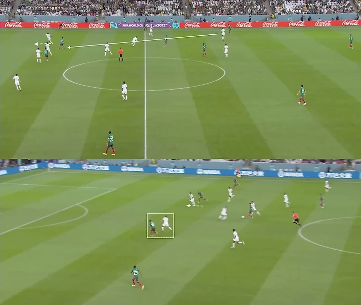 В качестве примера – уставшая, уже нестабильная в плане организации Саудовская Аравия образца последнего матча группы против Мексики. В самом начале матча Эдсон Альварес грамотно сыграл на паузе, поймав дернувшегося на шаг назад защитника саудовцев – Аль-Болеахи в том матче особенно часто заваливался, слишком опасаясь передачи за спину. Лосано принял передачу между линий, сместился внутрь, и в такой стрессовой ситуации линия саудовцев совсем рассыпалась – линию завалил уже Аль-Тамбакти. Так возник чистый выход 1 на 1.