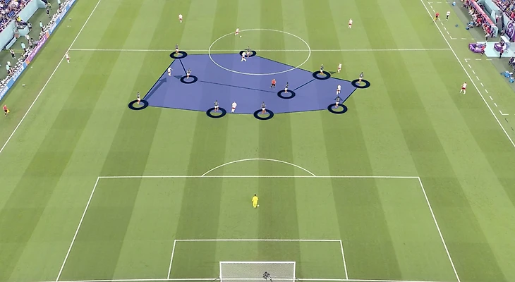 Чемпион мира, сборная Аргентины, оборонялась в стандартной для чемпионата мира манере. У команды Скалони было ограничение (необходимо было компенсировать слабый объем Месси без мяча), поэтому логично было обороняться долгими отрезками в среднем блоке. При этом Аргентина всегда имела прессинг-план на матч, поджимала соперника при розыгрыше от ворот, эпизодически поднималась из среднего блока.