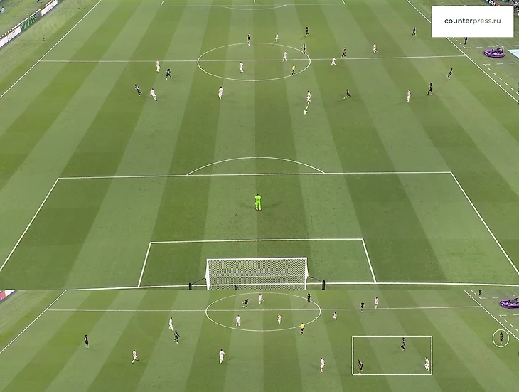 Также проблемы возникали с передачами за спину по флангу при подключении из глубины – об этом мы тоже сказали выше, разбирая проблемы такой системы обороны. Аргентина этим почти не пользовалась, хотя потенциал выманить крайнего защитника и разбить за спину был очевиден, и во втором тайме подобных попыток стало больше. Даже не получая моменты при такой игре, можно было посадить линию ниже, задергать линию, получать эпизоды владения на чужой половине – ауты, угловые, штрафные, собирать подбор, отбирать при контрпрессинге.