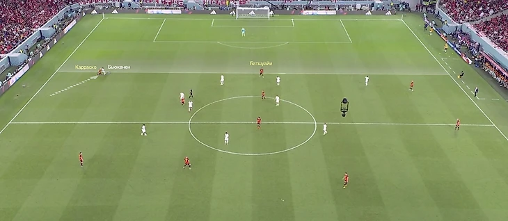Такую защиту можно ловить открываниями за спины в разные стороны и с разным таймингом. Бельгия в моменте с голом Канаде создала глубину открыванием Карраско – правый вингбэк Бьюкенен побежал за ним и поздно переключился с покрытия глубины на шаг, чтобы удержать линию (при этом и линию тоже просадил). Со второго замаха Алдервейрелд зарядил за спины по центру, где из-за позиции Бьюкенена Батшуайи оказался в правильном положении.