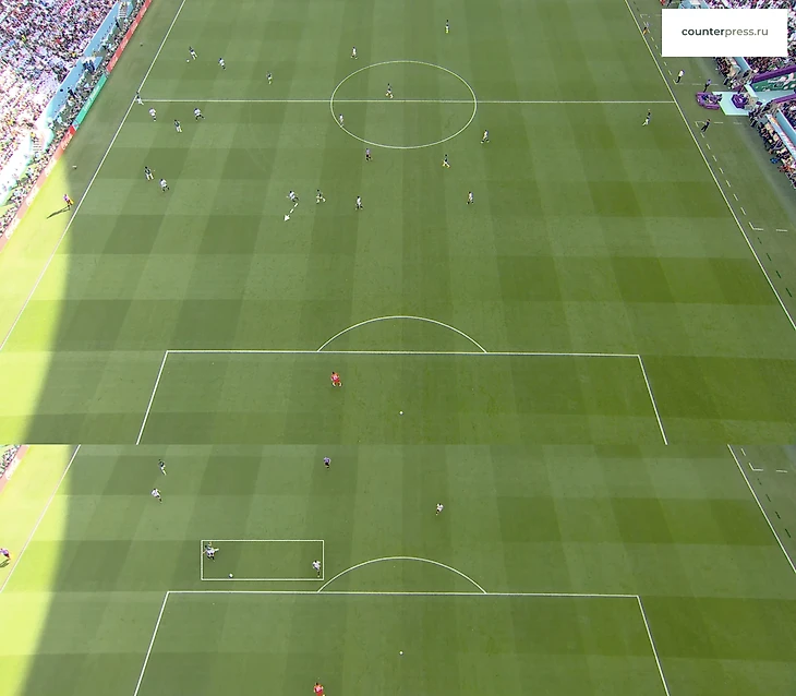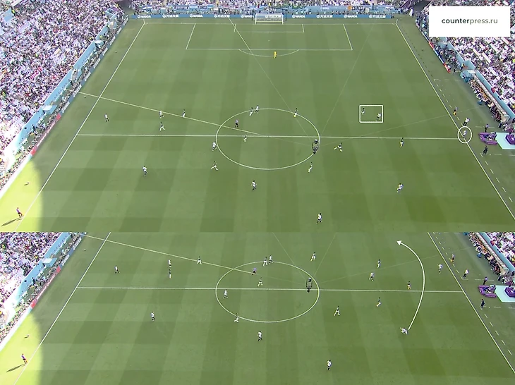 Давление в блоке было нестабильным – и это, наверное, главный аспект при здоровой критике обороны саудовцев в том матче. Команда стабильно загоняла во фланги и эпизодически интенсивно включалась в давление по обратной передаче с фланга, зажимая соперника, но на дистанции все же позволяла переводить мяч с одной стороны поля на другую. Крайние полузащитники могли падать низко, в том числе доигрывать за соперниками, падая в пятерку – как следствие, сильнее раскрывая пространство в центре и полуфлангах, сильнее нагружая заднюю линию. По ходу матча Аргентина все сильнее нажимала на эти слабости.