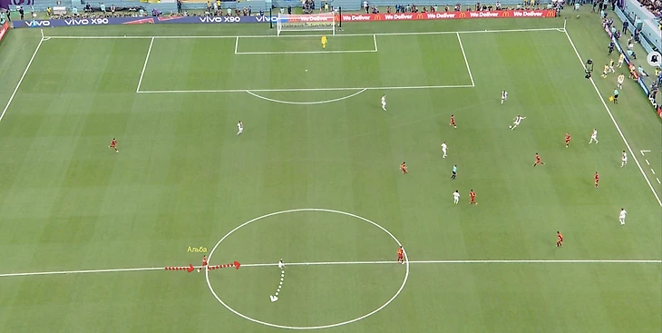 Игра на торможении может работать и против быстрых атак, когда защитники встречают в линию и реагируют не на открывание себе за спины, а на мяч, сжимая пространство вокруг игрока с мячом. Пример здесь – третий отменённый гол Аргентины против Саудовской Аравии: защитник, за спину которому забегал Лаутаро, сначала читал траекторию передачи от Месси, а когда Лаутаро поравнялся с ним, затормозил и запустил нападающего во вне игры.