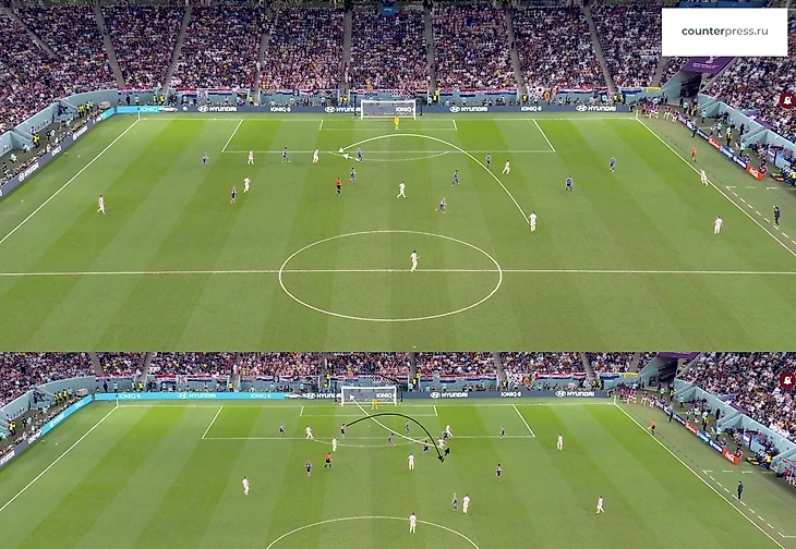 Эпизод Ловрен-Гвардиол заслуживает ещё одного короткого возвращения по теме, которую мы поднимали в наших соцсетях и затрагивали по ходу текста. Природа эпизода заключалась в разнице привычек центральных защитников Хорватии: Гвардиол в «Лейпциге» ловит нападающих на шаге вперёд на любой высоте, в том числе чтобы пресечь переход в атаку, тогда как Ловрен в «Зените» падал глубже остальных защитников и разворачивался корпусом к флангу, обеспечивая подстраховку крайнего защитника при продольной передаче. В сборной по ходу чемпионата мира проявлялись те же тенденции. В стрессовой динамике эпизода, где открытый мяч возник из-за внезапного отскока, оба защитника действовали на подсознательном уровне – то есть играли, как привыкли. Это могли бы исправить чёткие принципы защиты по открытому мячу, в рамках которых закладываются привычки – но у Хорватии их не было на дистанции турнира (и, если это происходит на шестой год работы тренера в команде, вряд ли они были и раньше).