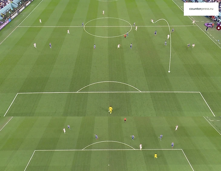 На чемпионате мира мы стабильно видели другой рисунок – нагруженная ширина, постоянный контроль вокруг защитного блока и минимум опций внутри. Часто внутри оказывались всего 2-3 игрока атакующей команды, отрезанные от остальной команды и вынужденные уходить за мячом в глубину (и ещё сильнее уменьшать численность внутри блока). С таким подходом можно выиграть пространство и посадить соперника глубже, но сложно растянуть его.