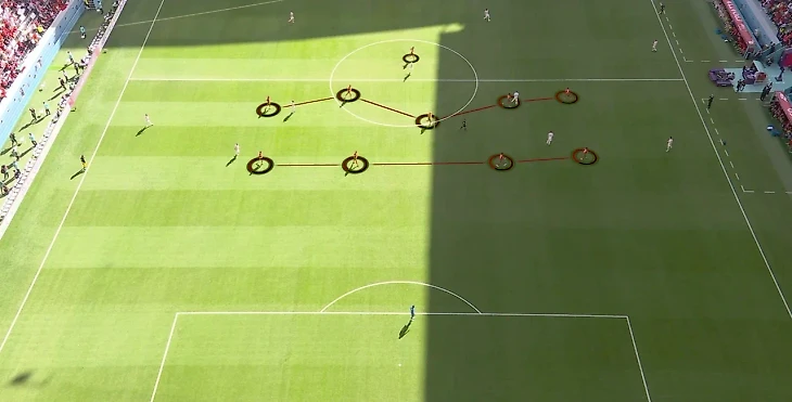 Выгоды такой системы – она обеспечивает команде компактность: пространство между линий почти не раскрывается. Плата за это – необходимость держать концентрацию и нужную по эпизоду интенсивность, чтобы поддерживать компактность и давление, как следствие – чтобы максимально убрать из игры открытые мячи с угрозой атаки глубины.