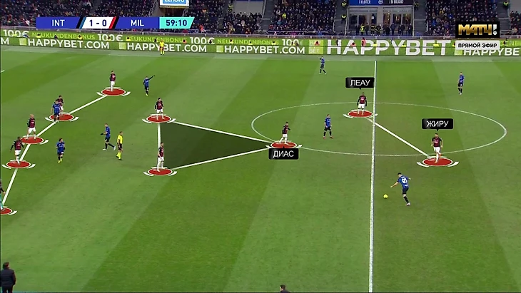 Даже когда «Милан» располагался четко по схеме, возникали определенные проблемы. Как правило, мы наблюдали такое соотношение сил – пять защитников, три полузащитника, Ориги против Чалханоглу, Жиру против Ачерби. Крайние центрдефы «Интера» (Бастони и Шкриньяр) получали свободу: