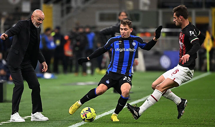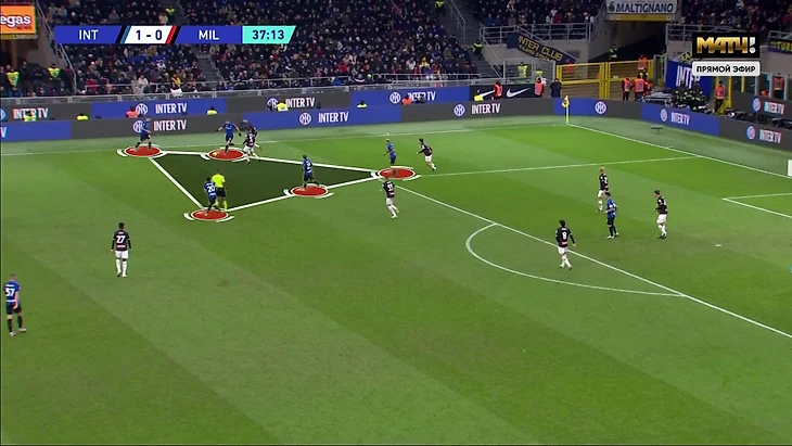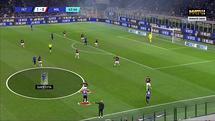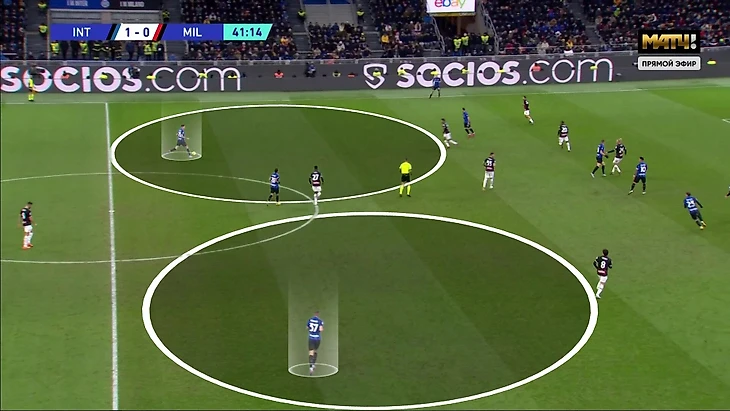 Эти игроки в системе «Интера» активно ходят в атаку и готовы продвигаться мячом, если им дают для этого возможность. Именно с их свободы начинались цепочки реакций, в которых «Милан» путался и допускал чудовищные ошибки. Часто для запуска механизма хватало простого прохода с мячом. Например, Шкриньяр продвигается, Тонали реагирует, партнеры плохо понимают, что делать дальше, а Барелла остается свободным: