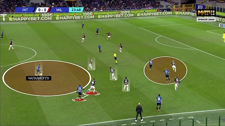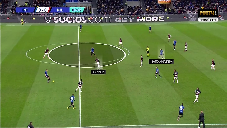 Проблема усугублялась тем, что, упуская крайних центрдефов, «Милан» не добивался сверхплотной игры в центре. По Чалханоглу действовал Ориги, но неприлично часто его терял. В эпизоде Ориги сначала выполняет задание по Хакану (из-за чего даже оказывается глубже, чем Тонали):