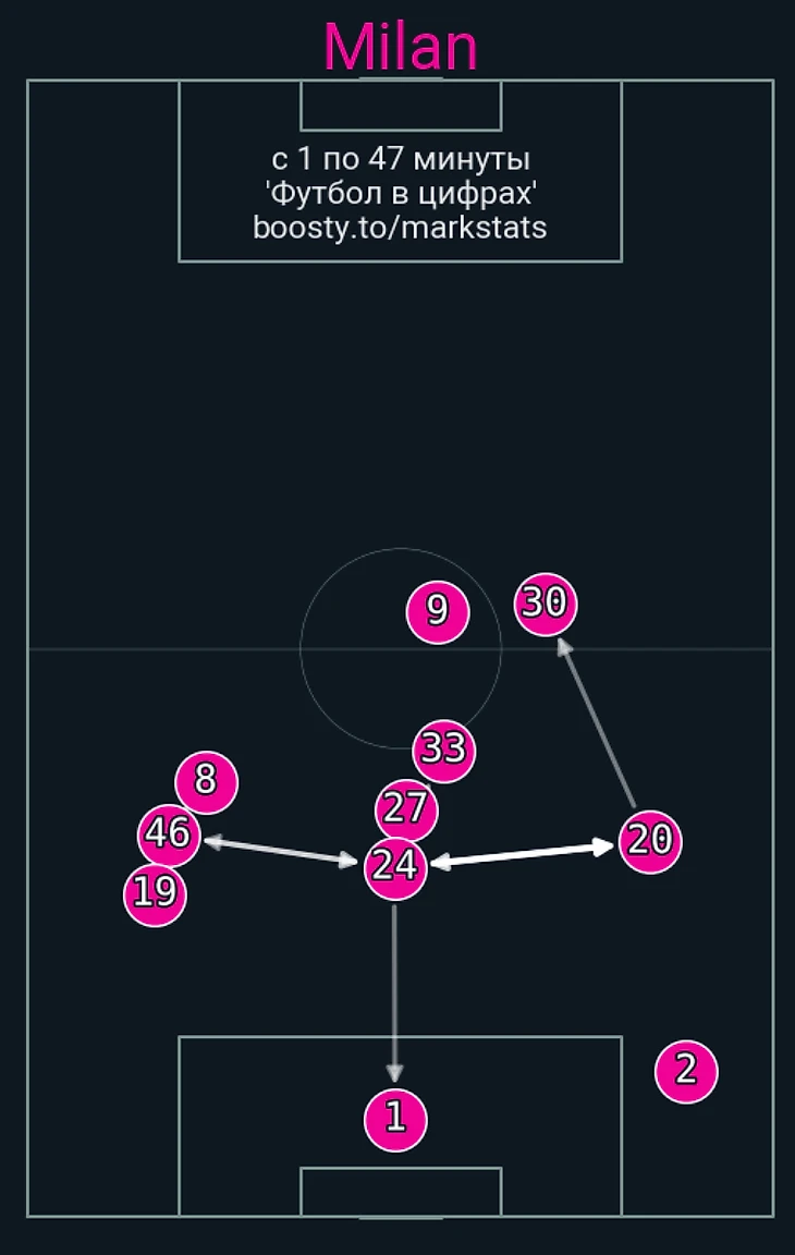 С мячом команда Пиоли выглядела аналогичным образом. Оцените гениальную карту передач из первого тайма (тут ярче всего прослеживаются проблемы стартового плана):