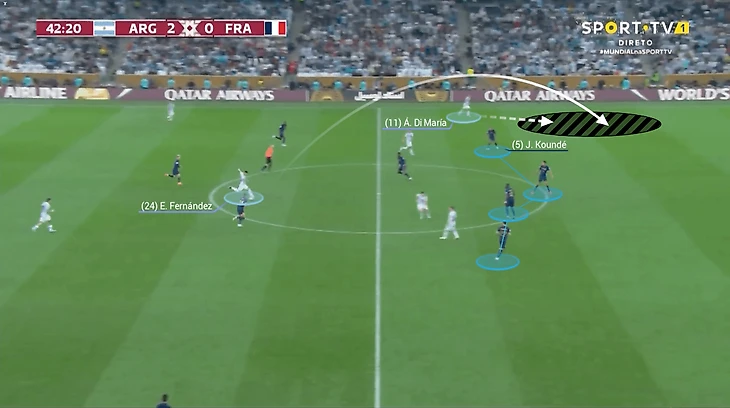 Аргентина регулярно создавала моменты для Анхеля Ди Марии против Жюля Кунде, во многом благодаря активности полузащиты на левом фланге: они постоянно снабжали Анхеля передачами.