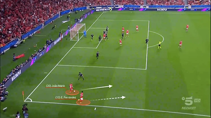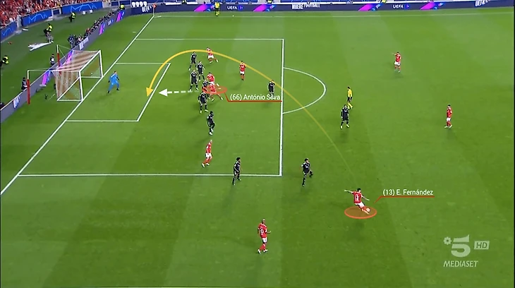 Чаще всего подобные навесы Энцо исполняет после коротких розыгрышей угловых. Фернандес подал 41 угловой в этом сезоне – больше всех в «Бенфике» (наряду с Дэвидом Нересом), но из них 27 стандартов было разыграно именно накоротке.