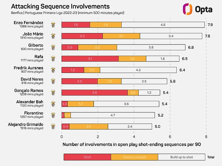 Если говорить простым языком, то Фернандес часто выступал эдаким метрономом для «Бенфики», в основном выступая левее в центре поля в схеме 4-2-3-1. Доказательством того, что он действительно диктует темп игры, является тот факт, что Энцо отдает в среднем 109 передач за 90 минут – это больше, чем кто-либо в чемпионате Португалии (из тех кто сыграл больше 900 минут).