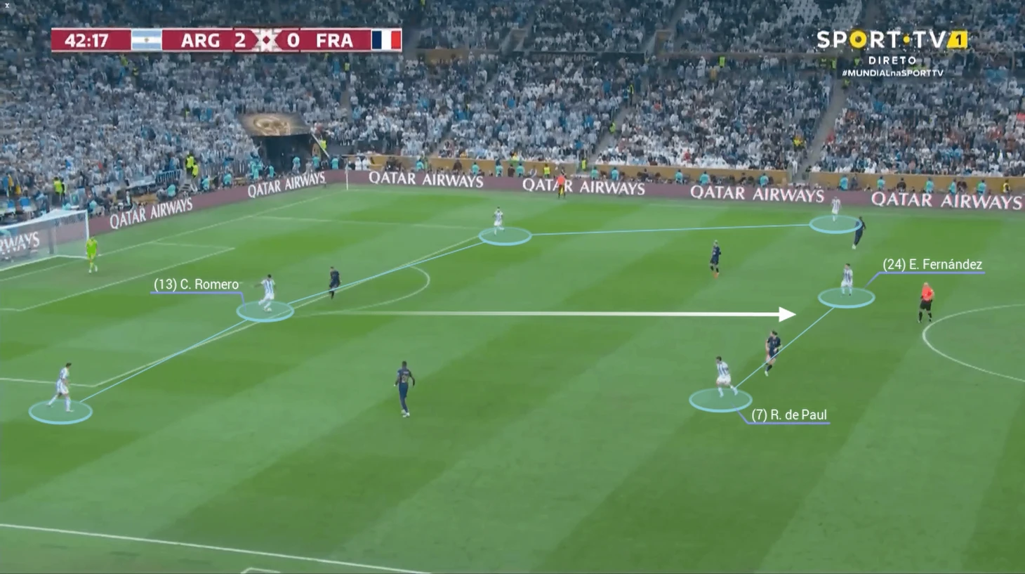 Разберем ситуацию Фернандес получает передачу от Кристиана Ромеро, разворачивается и делает заброс на Ди Марию.