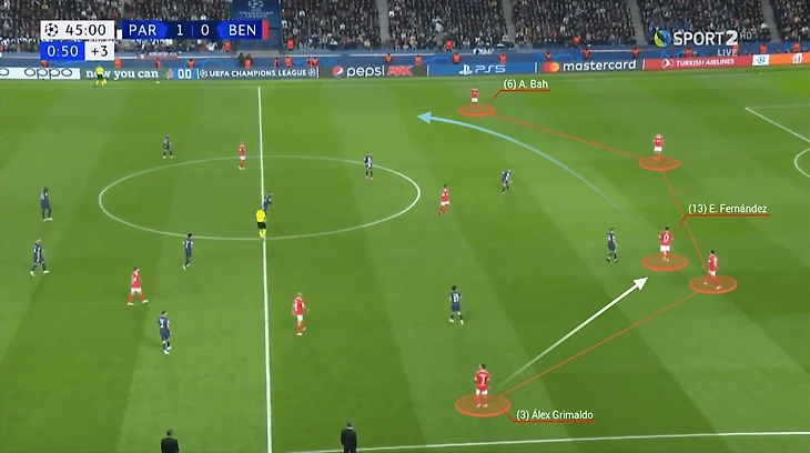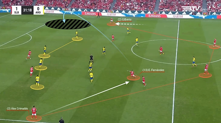 Роджер Шмидт, тренер «Бенфики», предпочитает чтобы его крайние защитники играли довольно высоко. Это дает Энцо пространство: он может включаться в свободные зоны и быть связующим игроком, особенно против команд, которые обороняются пассивно, садясь в блок всем составом.