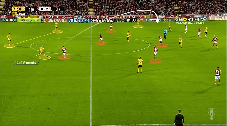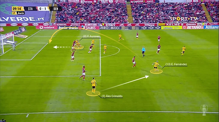 Креативность – не главное качество Фернандеса, но и в этом плане он успел блеснуть за «Бенфику» в этом сезоне, раздав 5 ассистов с 3,7 xA. В этих передачах уже видная фирменная фишка: это навесы на дальнюю штангу слева, возле штрафной. Против «Санта Клары» Энцо получил мяч от Алекса Гримальдо на подступах к штрафной, после чего увидел рывок вингера, Фредрика Аурснеса.