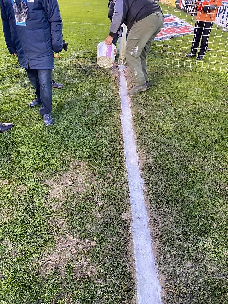 Они просто офуеть какие наглые: просто сделали углубление в месте замера (то бишь на той самой линии ворот), сверху криво провели валик с краской (типа линия же вот, белая) и весь этот цирк должен был якобы не заметить инспектор делающий замеры прям из "канавы"))
