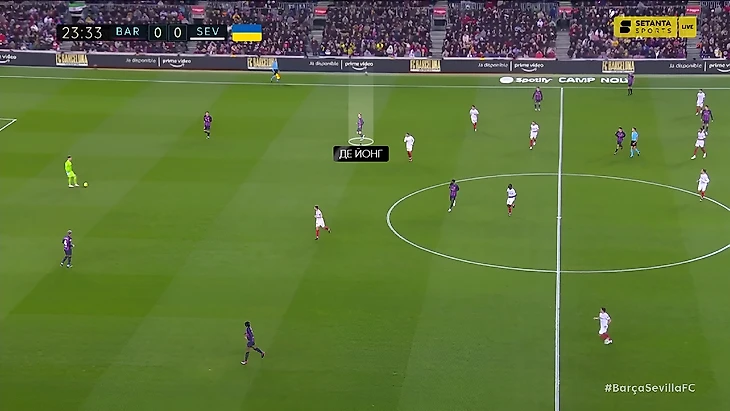 Одним из проявлений неразберихи «Барселоны» в первом тайме – ситуативные смещения де Йонга на левый фланг: