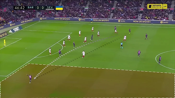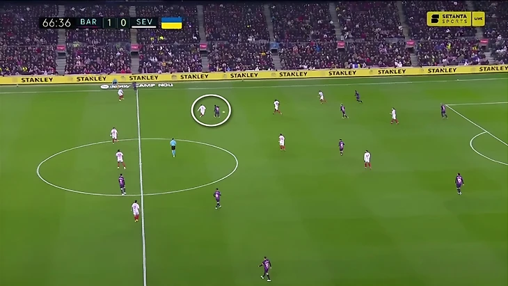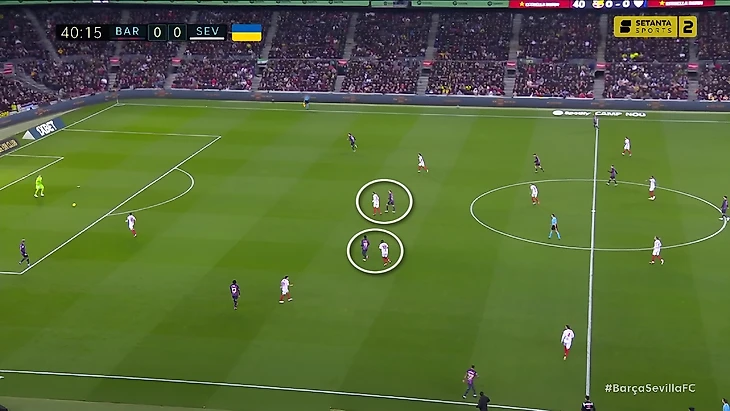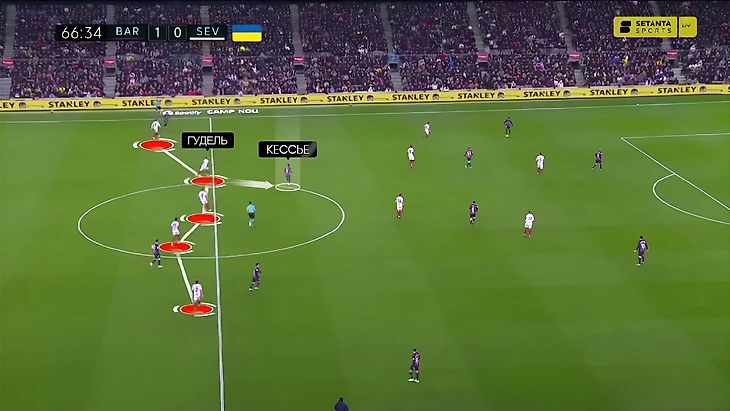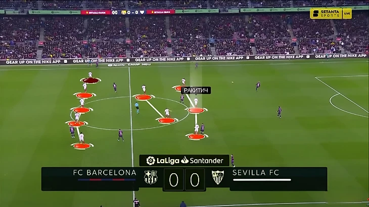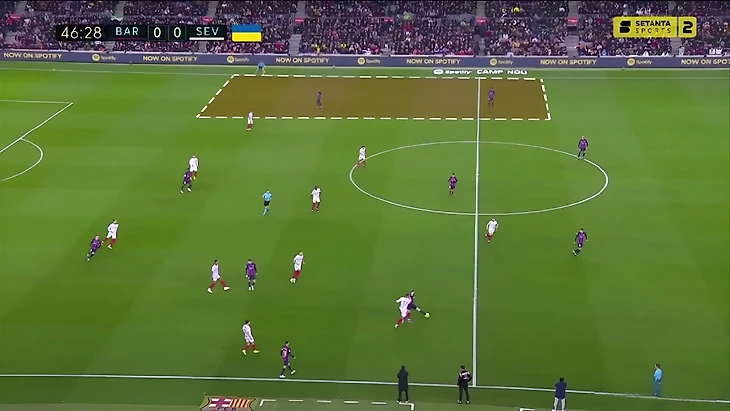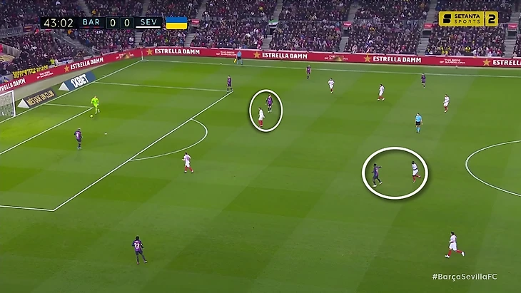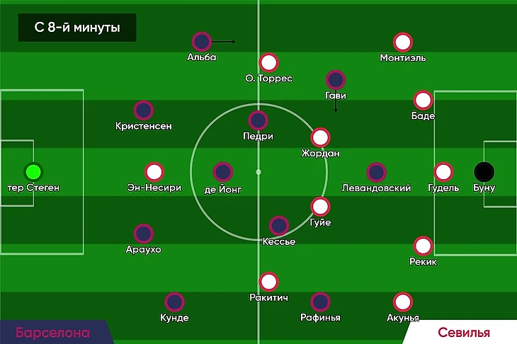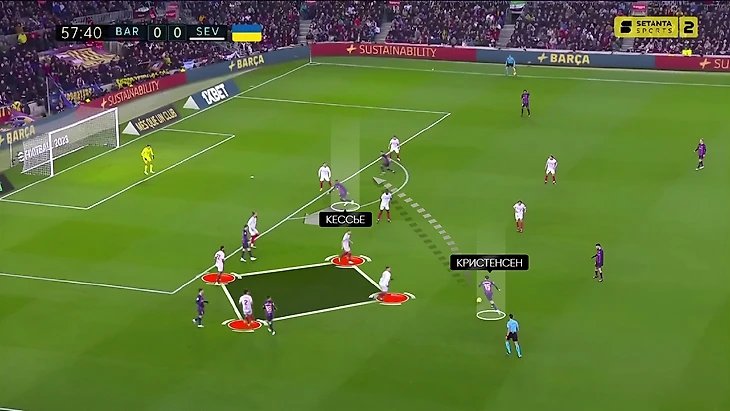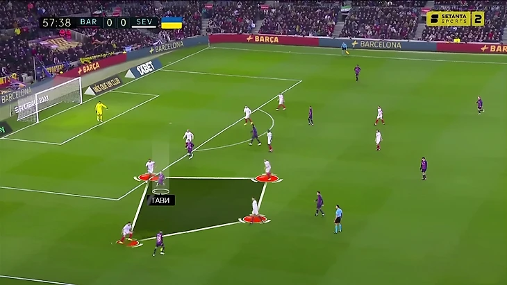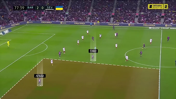 Первый гол «Барселоны» как раз стал следствием изменений в перерыве. «Барса» смещает атаку влево, игроки «Севильи» смещаются за мячом (в том числе благодаря движению Гави):