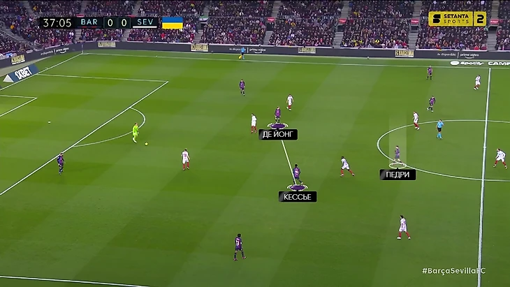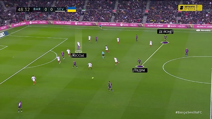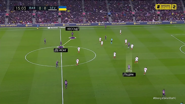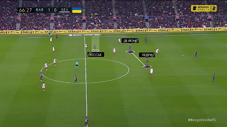 А вот уже Педри опускается к де Йонгу, а Кессье располагается над ними: