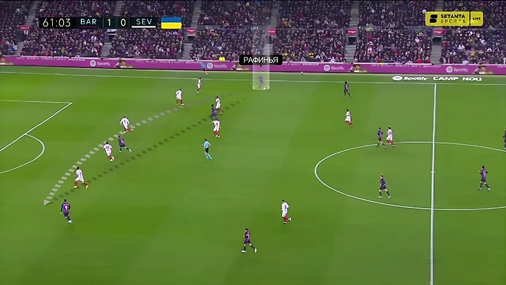 Ещё одна проблема в первом тайме – игра Рафиньи. В позиционных атаках бразилец оставался в широкой позиции, по сути дублируя роль Дембеле: