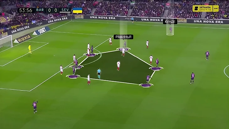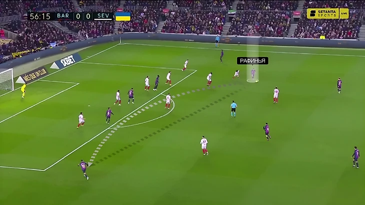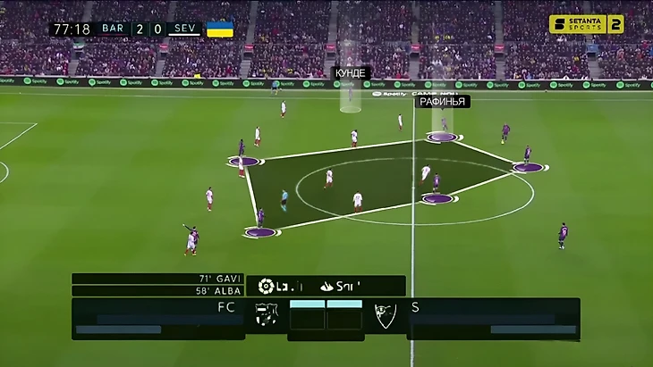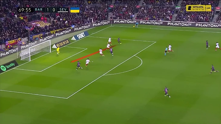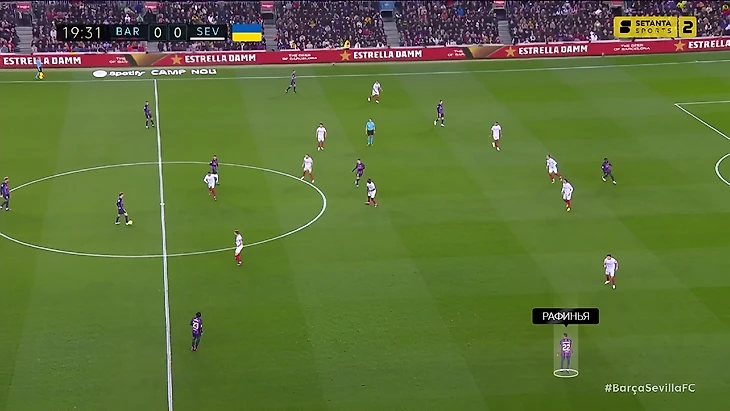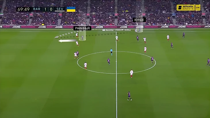 Добила «Барса» «Севилью» в совсем уже простой ситуации: сначала команде снова удаётся стянуть «красно-белых» на правую половину поля – пятёрка игроков в полузащите (вместе с Рафиньей), а ширину выдерживает Жюль Кунде. Слева свободен Альба, а Гави открыт между линиями: