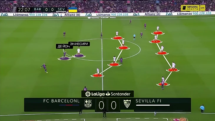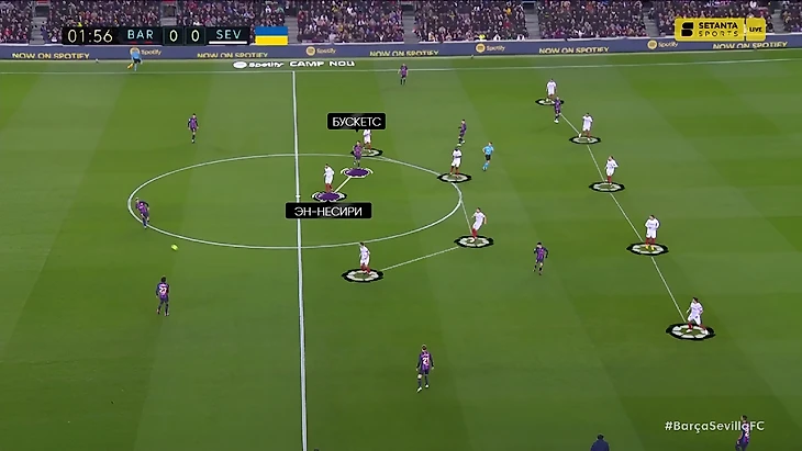 Ещё одна причина не самого уверенного тайма в исполнении «Барселоны» – план Сампаоли на этот матч. Аргентинский специалист изначально понимал, что «Севилья» в таком состоянии просто не способна противостоять «Барсе» не отходя от своей обычной модели игры. В некоторых матчах у «Севильи» прослеживается та самая идентичность (в игре с «Эльче», например, «красно-белые» владели мячом 81%), но против «Барселоны» мы увидели 5-4-1, где Эн-Несири действовал по опорнику (сначала по Бускетсу, а затем по де Йонгу):