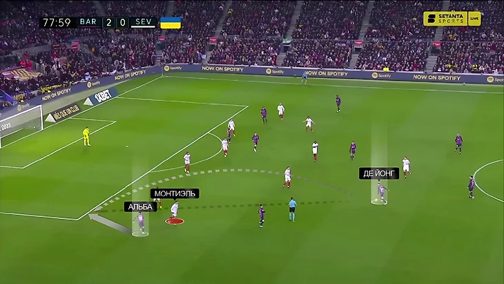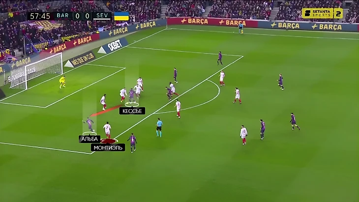 А затем, уже стянув «Севилью» на правый фланг, «каталонцы» с помощью перевода Рафиньи возвращают мяч на левый фланг, где абсолютно свободный Альба: