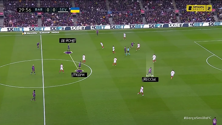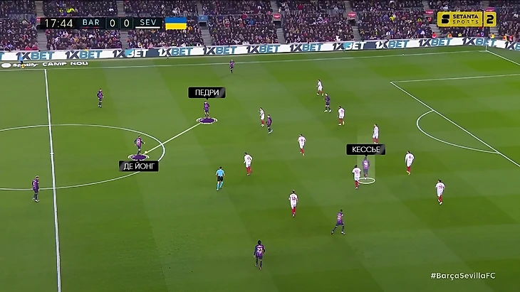А вот «Барселона» на второй тайм, видимо после инструкций Хави в перерыве, вышла с более чёткими ролями в полузащите. Если в первой половине встречи Кессье и Педри периодически составляли опору Френки де Йонгу, то во второй ивуариец стал уже чётко играть возле штрафной, а испанец опустился к Френки: