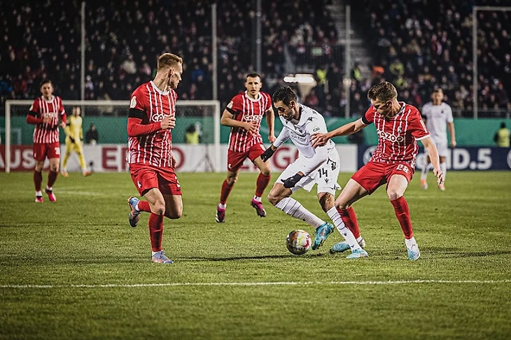 Встреча двух немецких клубок закончилась серией пенальти, в основное и добавочное время командам не удалось выявить победителя. Это был матч двух клубов из второй Бундеслиги, где команда идущая на 16-ом месте принимала в гостях шестую строчку турнирной таблицы. Польский нападающий Давид Ковнацки вывел гостей вперёд на 33-й минуты и до 93-й минуты исход встречи был более менее очевиден, но Тайлан Думан решил перевести игру в экстра-тайму и сравнял счёт встречи. В дополнительное время команды играли практически без замен: у гостей произошла замена по позиции, а хозяева уменьшили численный состав на поле — Флоран Флик был удалён за вторую жёлтую карточку.
