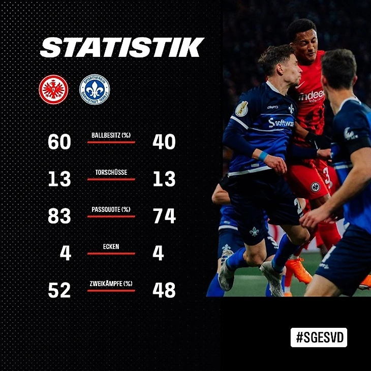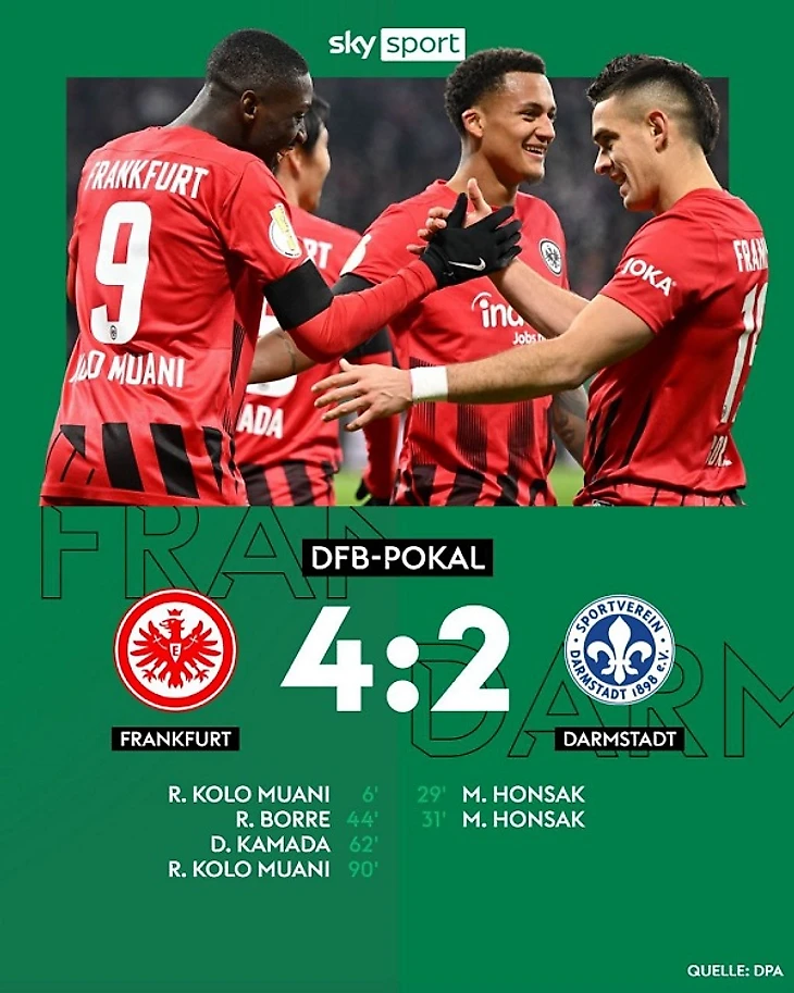 Однако недолго гости вели в счёте — под конец первого тайма Рафаэль Сантос Борре сравнял счёт. А во втором тайме «орлы» довели дело до конца, даже несмотря на то, что «лилии» действовали очень опасно и могли забивать ещё, но индивидуальное мастерство игроков «Айнтрахта» взяло верх. Сначала Даити Камада забил третий мяч «орлов» после классной атаки, а уже под конец матча Рандаль Коло Муани оформил дубль после великолепного паса Марио Гётце. Итог — непростая победа «орлов» и выход в четвертьфинал.