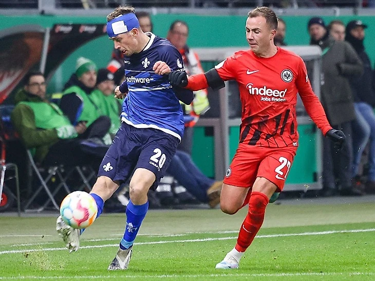 «Айнтрахт» отлично стартовал, выйдя вперёд после своей первой атаки на шестой минуте — Аурелио Бута прорвался по правому флангу и ассистировал на Рандаля Коло Муани, который точно пробил головой в верхний угол. Спустя пять минут «орлы» могли увеличить преимущество, и снова после паса Буты с правого фланга, однако Борре пробил над перекладиной. На 23 минуте снова был хороший шанс у хозяев — новичок «Айнтрахта» Филипп Макс сделал отличный пас на Гётце, но полузащитник с отличной позиции пробил прямо во вратаря. Вскоре «орлы» явно пожалели об упущенных возможностях, потому что лидеры второй Бундеслиги смогли перевернуть ход встречи буквально за две минуты — Роде потерял мяч в центре поля, в результате чего «лилиям» удалось разыграть классную атаку. Здесь провалилась и защита «орлов», Эван Н’Дика остался один против троих игроков команды соперника, и явно ничего не смог сделать против них, в результате Маттиас Хонсак сравнял счёт. Буквально сразу после забитого мяча Хонсак оформил дубль, и «лилии» вышли вперёд.