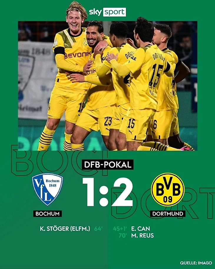 Боруссия» всё-таки вырвала победу. Марко Ройс забил спустя пять минут после своего выхода на замену и вывел свою команду в четвертьфинал турнира, поскольку в оставшиеся 20-минут встречи «Бохум» так и не смог отыграться и более того скорее был близок к еще одному пропущенному.