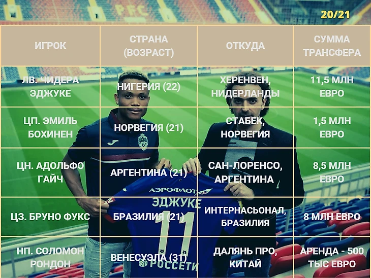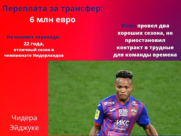 Будто не заметив пандемии, «армейцы» потратили приличные суммы на укрепление состава в августе 2020. Выхватив молодых и крайне перспективных Эйджуке, Гайча и Фукса, в клубе явно надеялись на большее чем в итоге все получилось. Нигериец радовал своим дриблингом, но как только появилась возможность, приостановил контракт и сбежал в «Герту», бразилец оказался до смеха травматичным, а Гайч не прижился по множеству других причин. Надежды на то, что деньги московский клуб отобьет, почти нет, несмотря на то, что все трое сейчас в арендах.